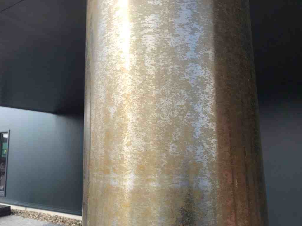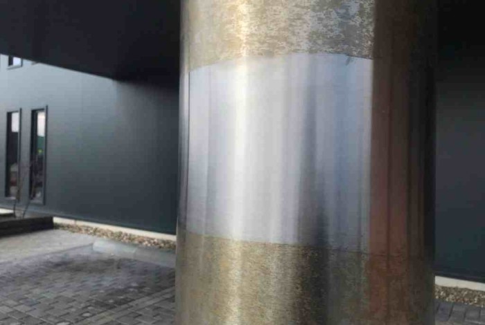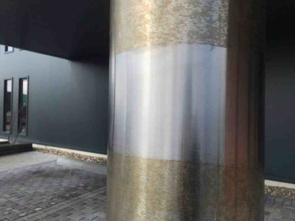 Dit betreft een kolom van roestvast staal AISI316 dat in Friesland aan een gebouw in de buitenlucht is geplaatst. Na verloop van tijd zijn deze vlekken ontstaan, hoewel er in dit geval geen enkele sprake is van maritieme omstandigheden. Dan hoor je nog wel eens zeggen ‘hoe kan roestvast staal nu roesten want het is toch roestvrij?’. Het juiste antwoord is dan ‘roestvast staal is niet onderhoudsvrij maar onderhoudsarm’.